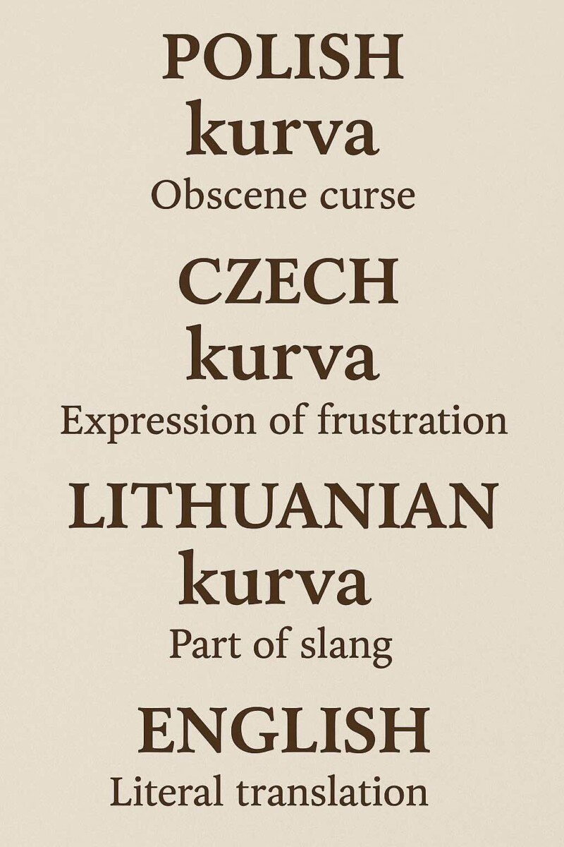 The form you’ll meet varies by language: kurwa (Polish), kurva (Czech, Slovak, Hungarian, Lithuanian slang), курва (Ukrainian, Russian archaic), curvă (Romanian).