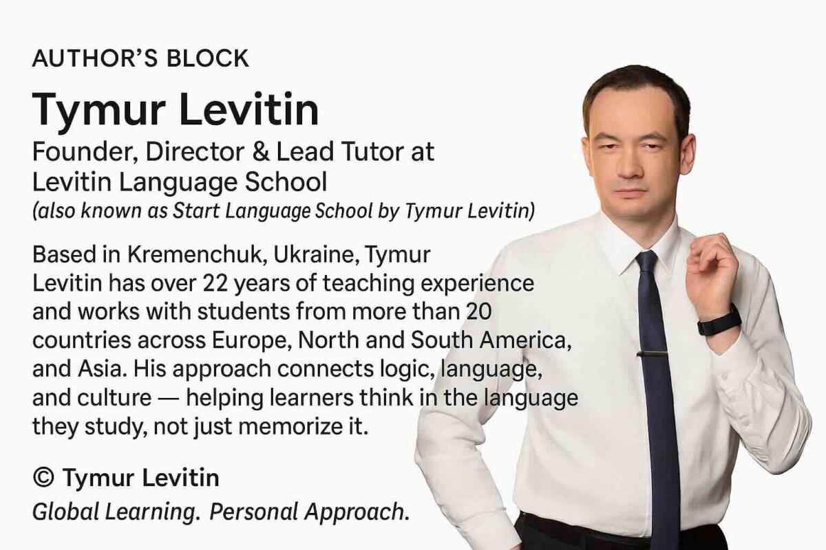 Based in Kremenchuk, Ukraine, Tymur Levitin has over 22 years of teaching experience and works with students from more than 20 countries worldwide. His approach connects logic, language, and culture — helping learners think in the language they study, not just memorize it.