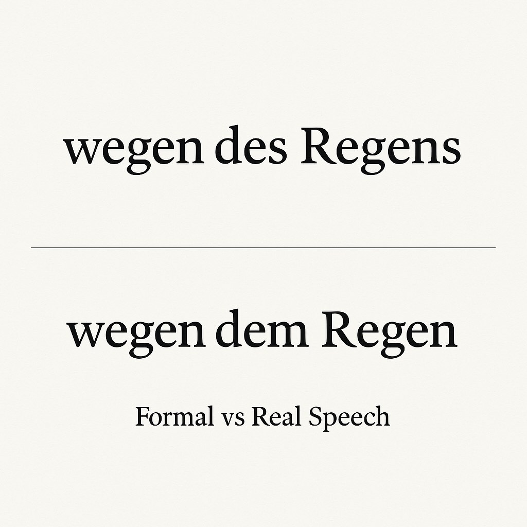 - Southern German / Austria / Switzerland: stronger dative tendencies after prepositions (wegen dem, etc.); Swiss German often avoids genitive in colloquial registers.