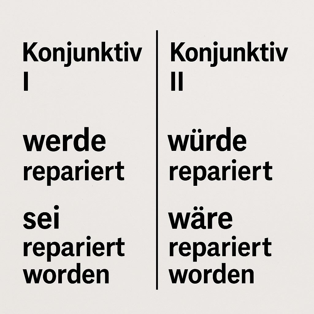 ⚠️ Note: Many K-I forms (werde repariert) = identical to indicative. Writers often switch to K-II to mark distance.